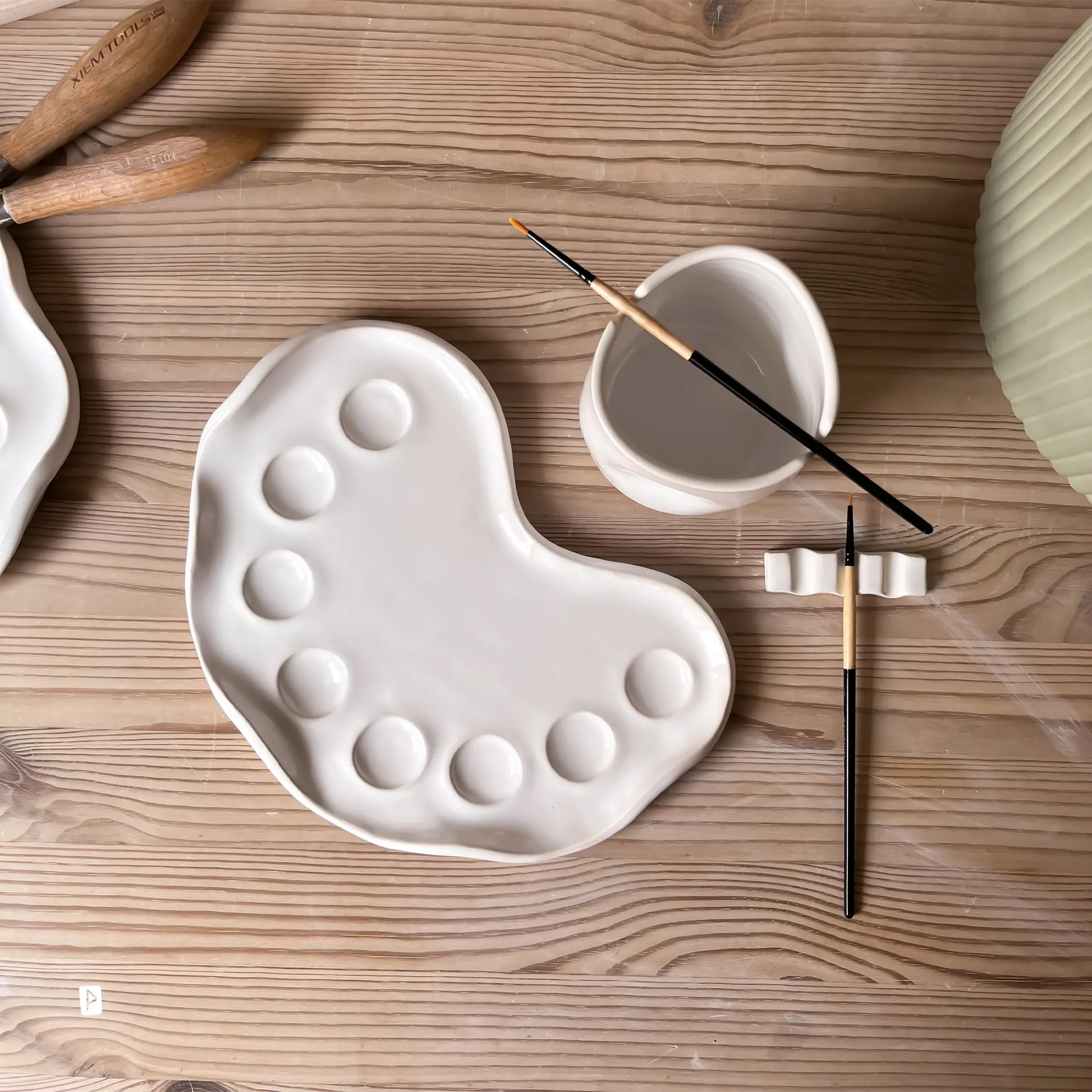 Set of three ceramic pieces for painter, consisting of a curved palette, a cup and a handmade ceramic brush holder, glazed in white finish. Ideal for painting, these pieces are light and easy to clean.