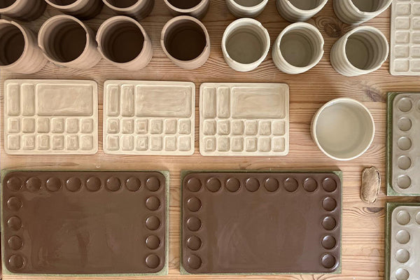 Painter's set consisting of a large palette, a cup and a ceramic brush holder handmade in mottled stoneware clay and glazed in white matte. Whether you are just starting out in painting or you are a professional artist, this set will help you in the creation of your future works of art. Or make it an ideal gift for a friend or family member!