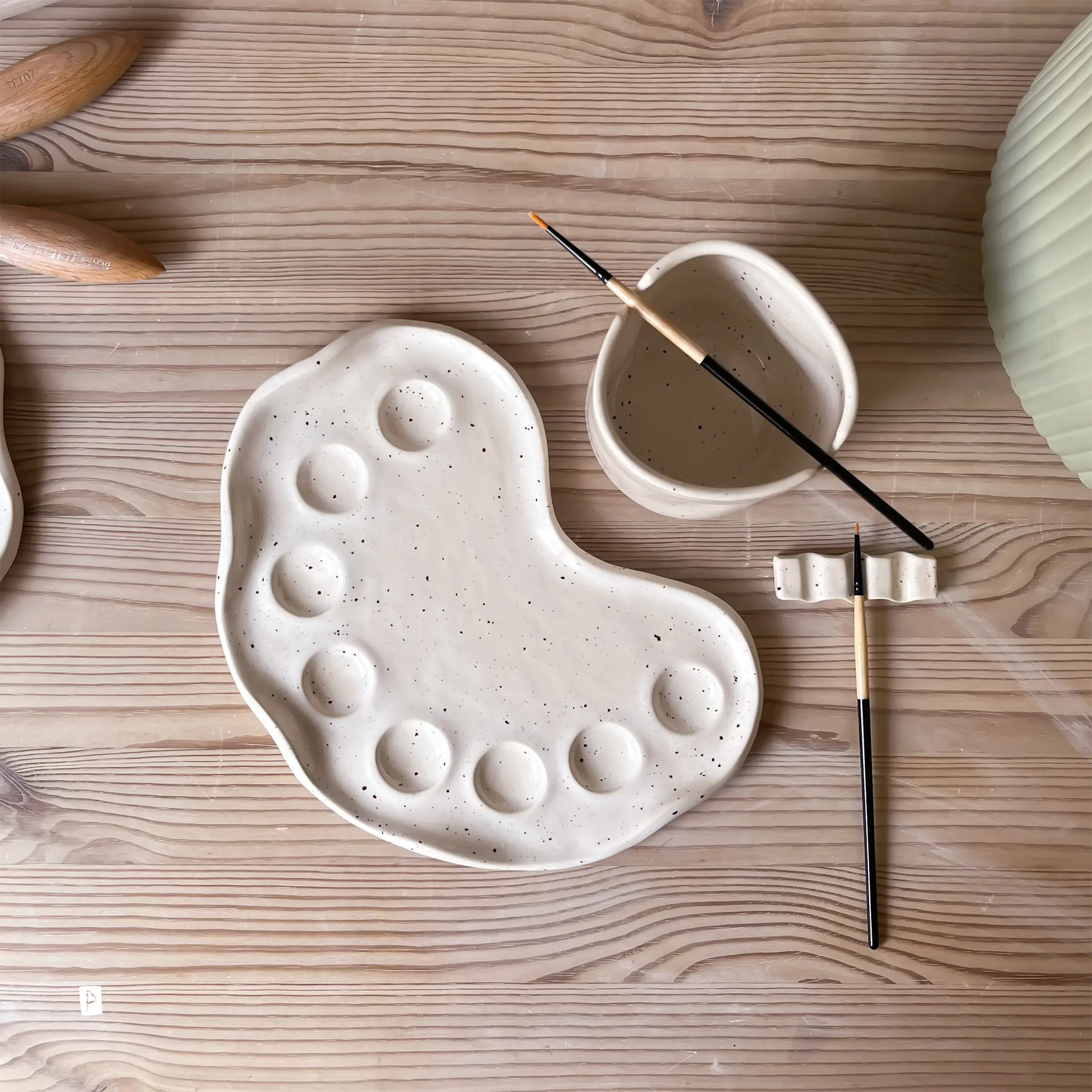 Set de tres piezas de cerámica para pintor, compuesto por una paleta curva, un vaso y un reposa pinceles de cerámica hechos a mano y esmaltados en acabado oreo cream. Ideal para pintar, estas piezas son ligeras y fáciles de limpiar.